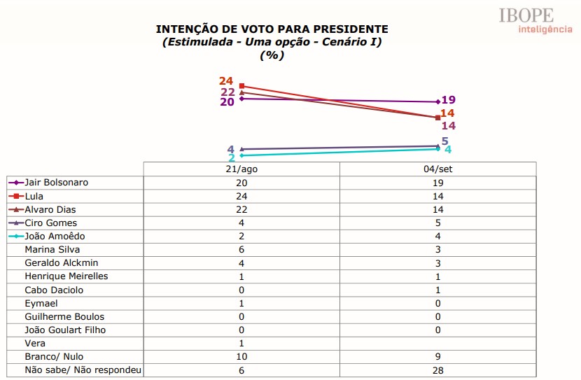 Bolsonaro, por sua vez, oscilou um ponto para baixo, de 20% para 19%.