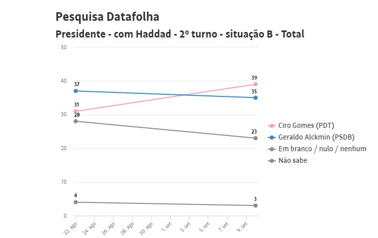 Não consigo entender esse pessoal petista que está ironizando o Miguel. Quem vê pensa que o Haddad está disparando e o Ciro está patinando, quando as últimas pesquisas do IBOPE e essa do Datafolha de hoje mostram justamente o contrário: Haddad cresceu pouquíssimo e Ciro está nitidamente com um viés de alta.