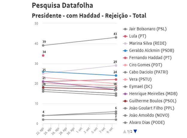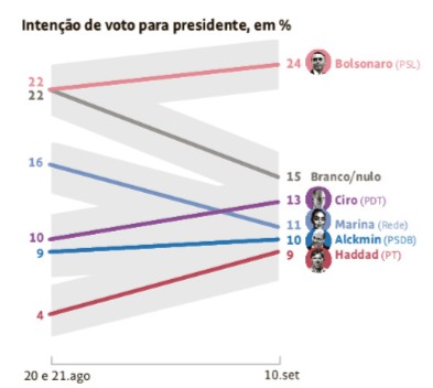 Na pesquisa anterior do Datafolha, realizada em 20 e 21 de agosto, antes do início do horário eleitoral, Bolsonaro tinha 22% das intenções de voto. A oscilação observada desde então está dentro da margem de erro da pesquisa, que é de dois pontos percentuais para mais ou para menos.