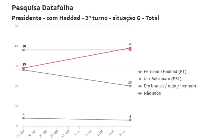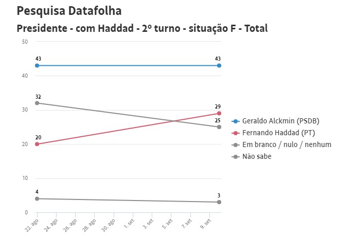 Falta apenas 4 pontos para Haddad alcançar o segundo colocado. Tanto no Datafolha como na FSB.