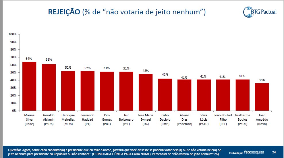 Já Marina Silva ultrapassou Alckmin na lista de maior rejeição – ou seja, a porcentagem de quem não votaria “de jeito nenhum” no candidato/candidata – passando de 58% para 64%, um forte aumento ainda mais considerando os 54% de rejeição registrados no levantamento de duas semanas atrás. Alckmin oscilou para baixo em termos de rejeição, passando de 63% para 61%. O tucano é seguido por Meirelles, que teve queda de 55% para 52%, mesmo percentual de Haddad. Ciro Gomes e Bolsonaro possuem 51% de rejeição, mesmo patamar do levantamento anterior.