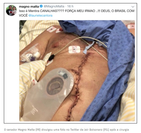 A foto divulgada por Magno Malta, antes da segundo cirurgia de Bolsonaro, é verdadeira, conforme apurou o site Poder 360.