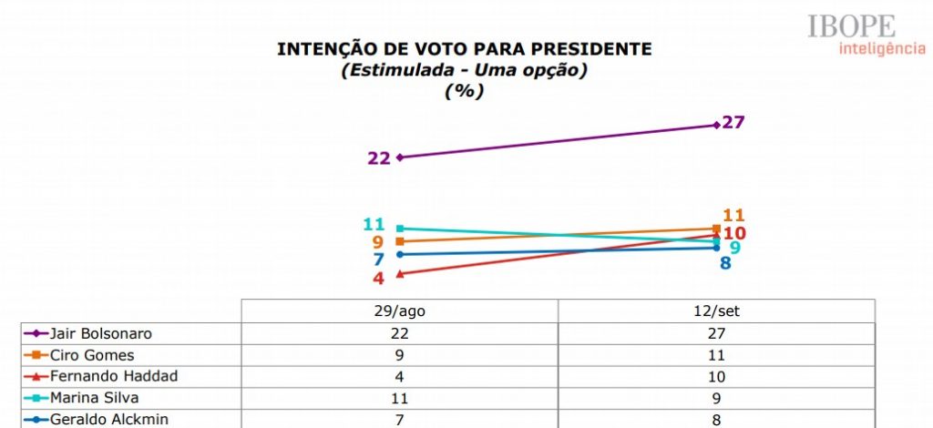 Bolsonaro avançou bastante. Ciro oscilou 2 pontos para cima, Marina 2 pontos para baixo, e Haddad cresceu 6 pontos, de 4 para 10, embolando no segundo lugar.