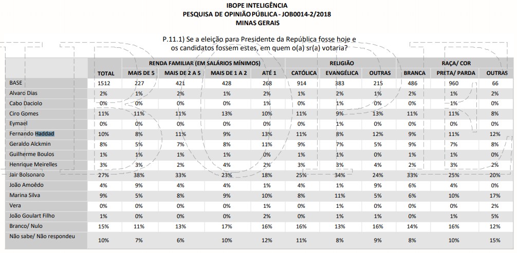 Em votos válidos, Haddad já tem 14% em Minas, empatado rigorosamente com Ciro, que também tem 14%.