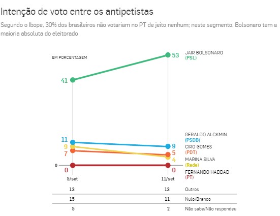 Os dados são de levantamento do Ibope feito entre os dias 8 e 10, depois de Bolsonaro ter sido esfaqueado em um evento de campanha em Juiz de Fora (MG), fato que provocou comoção e aumento expressivo da exposição do candidato do PSL nos meios de comunicação. Para medir o eleitorado antipetista e averiguar sua composição social, o Ibope perguntou aos eleitores: “Em qual desses partidos políticos o(a) senhor(a) não votaria de jeito nenhum?” Com 30%, o PT ficou em primeiro lugar no quesito rejeição, com larga margem sobre o segundo colocado, o PSDB (8%).