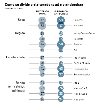 Em termos de escolaridade, os antipetistas têm mais anos de estudo e se concentram na elite. Um em cada três eleitores com essa característica tem curso superior, enquanto a média do eleitorado total é de apenas um em cada cinco. No outro extremo, entre os que estudaram até a quarta série, a proporção de antipetistas equivale à metade da média nacional.