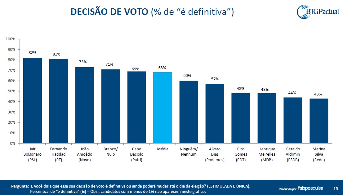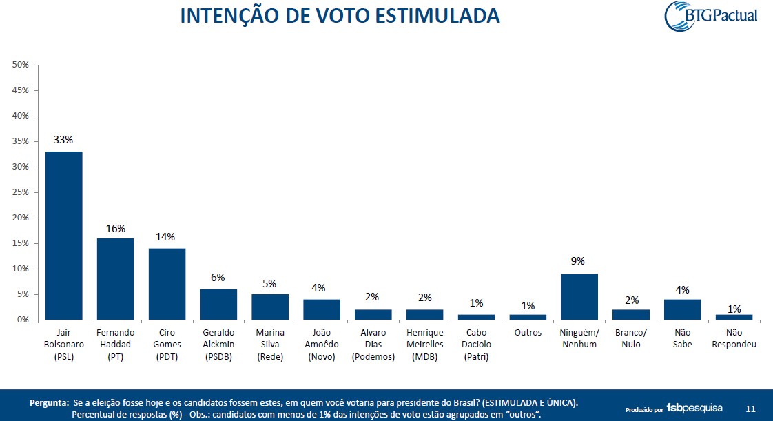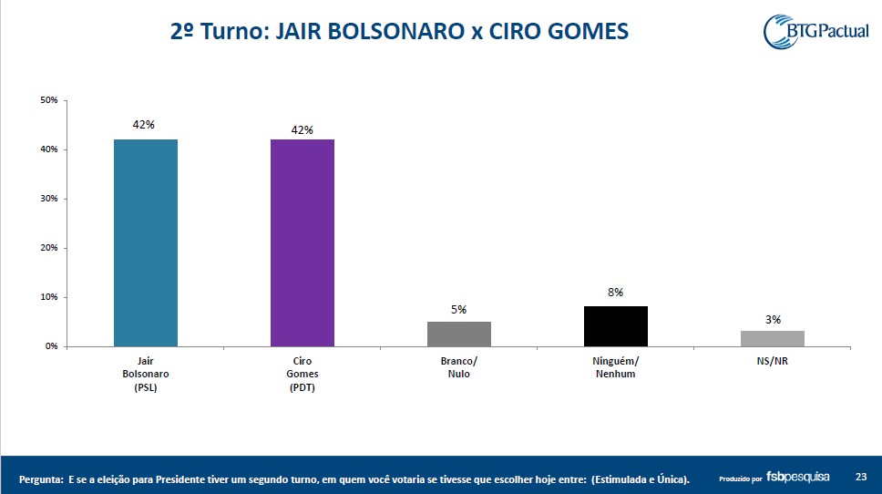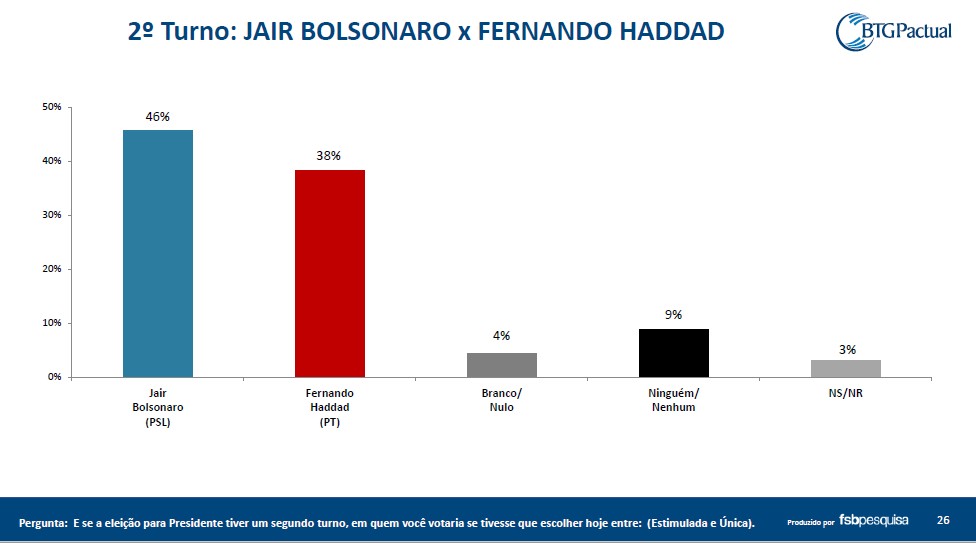 Essa pesquisa do BTGPactual até agora é a mais coerente, porém, continuam errando na possibilidade de 2° TURNO. Alckmin, por sua vez ao invés de atacar o CIRO, HADDAD e MARINA para garantir um segundo lugar, preferiu atacar o bolsonaro e se deu mau, o resultado acabou beneficiando o próprio bolsonaro que acabou sendo vitima de sua campanha agressiva levando uma facada, o tornando ainda mais conhecido e fez com que as pessoas pesquisassem sobre quem é de fato JAIR BOLSONARO, e descobriram que ele tinha razão em quase todas as suas brigas, e pelo fato de ter 27 anos no congresso e não se envolver em corrupção, algo, inimaginável no cenário atual, ex: TIRIRICA, o palhaço incoerente que pediu pra sair antes das repercussões de seus votos na direção de partidos envolvidos em corrupção. CIRO, HADDAD e ALCKMIN, qualquer um desses se tiver segundo turno, vão sofrer nas campanhas pelo fato de todos estarem envolvidos em corrupção e processo criminal. Não acredito no voto eletrônico e nessas eleições será impossível fraudar as urnas, acho um risco muito grande de acabar com esse pouco de paz que nos resta caso fraudem as urnas, será um colapso e uma possível intervenção militar acontecer será ainda maior no caso de um novo governo de esquerda. Hoje, o Brasil pede mudança, e na minha visão o BOLSONARO representa essa mudança, cito sua evolução como ser humano, sua equipe de ministros isentos e o plano de governo apresentado, dentro da realidade e sem enganar o povo. Vemos nos outros candidatos as mesmas falas de sempre, nada de diferente, agora mais ainda, o povo não aguenta mais assistir promessas sabendo que o país está quebrado, isso nos reflete uma mentira descarada e sem vergonha nenhuma. fico por aqui e só pra finalizar, ainda não achei um eleitor de MARINA, CIRO e ALCKMIN, achei do LULA, mais como ele está preso, como pode essas pesquisas colocarem ele com mais de 5% das intenções de voto? Fic a reflexão.
