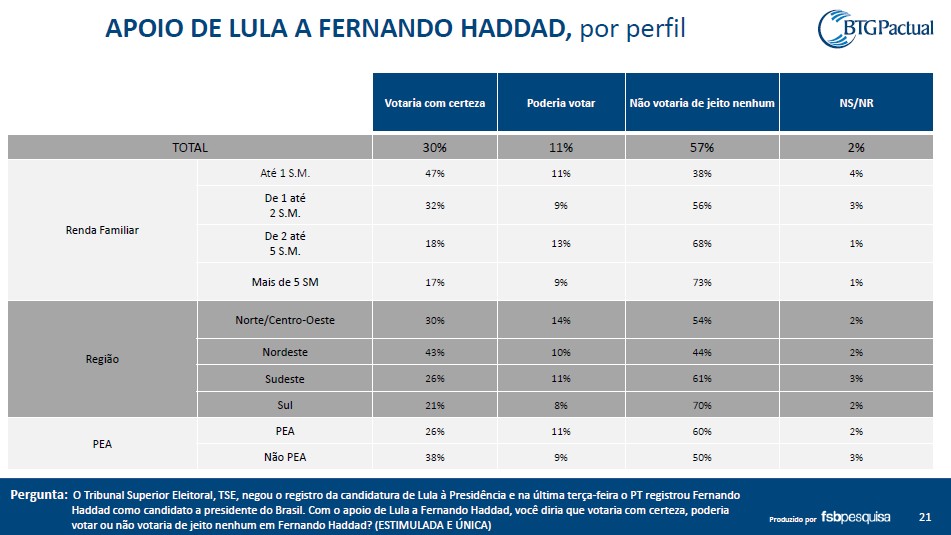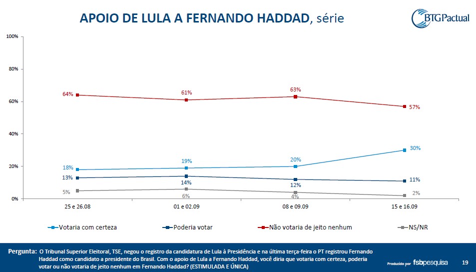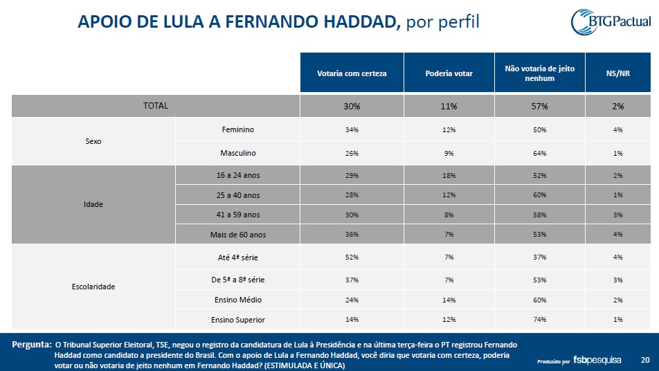 O apoio de Lula, porém, traz também uma rejeição forte. Ainda há quase 60% (mais precisamente, 57%) dos eleitores que afirmaram que não votariam em Haddad “de jeito nenhum” em função do apoio de Lula.