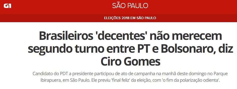 Muitos petistas andaram divulgando, furiosos, a manchete do G1 para um comício de Ciro Gomes no parque Ibirapuera, em São Paulo.