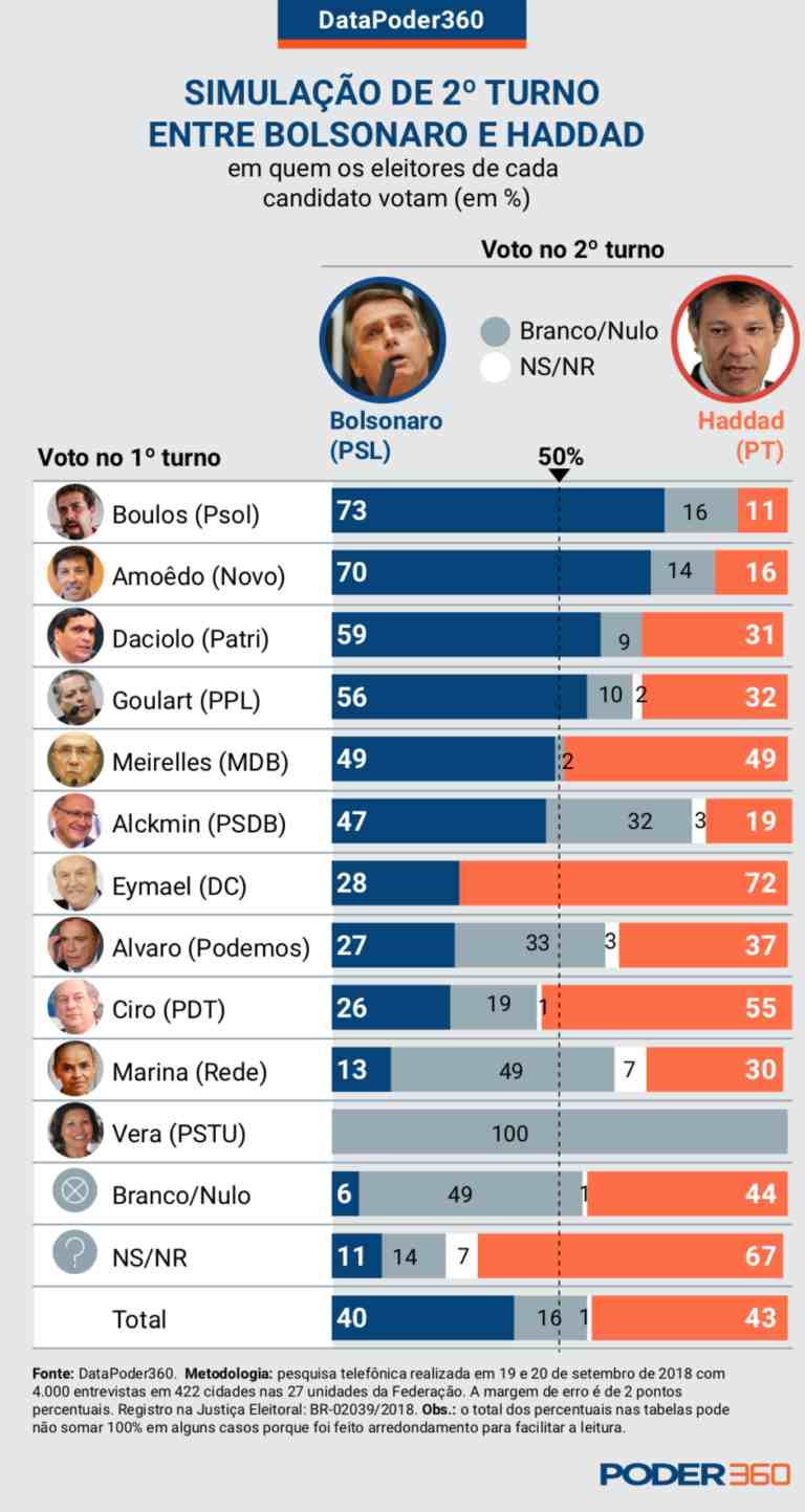 No entanto, os cenários de segundo turno não sofrem este viés. O que pode indicar que sim, Haddad já deve estar passando Bolsonaro no segundo turno.