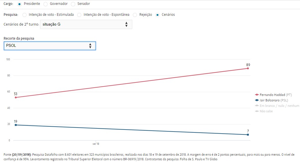 A Folha fez ainda uma página dinâmica com os números do Datafolha, que nos permite cruzar os dados. É possível saber, por exemplo, em quem os eleitores simpatizantes do PSOL votarão num eventual segundo turno entre Haddad e Bolsonaro. Eis o resultado: quase 90% dos simpatizantes do PSOL votarão em Haddad. Isso sim faz sentido, né?