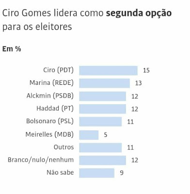 Este é sem dúvida alguma um trunfo que Ciro usará para pedir o voto útil do campo progressista. Uma vez que Ciro sempre ganha com folga de Bolsonaro e, Haddad, ao contrário, não. Outro item que me chamou a atenção foi a pesquisa de “segundo voto” perguntado pelo Datafolha. Nela mostra que Ciro lidera com 15% desta escolha secundária. Mais um fator para o pedetista mostrar que é a terceira via; sim, porque boa parte dos votantes não querem Haddad e tampouco Bolsonaro. Vejam o índice mencionado: