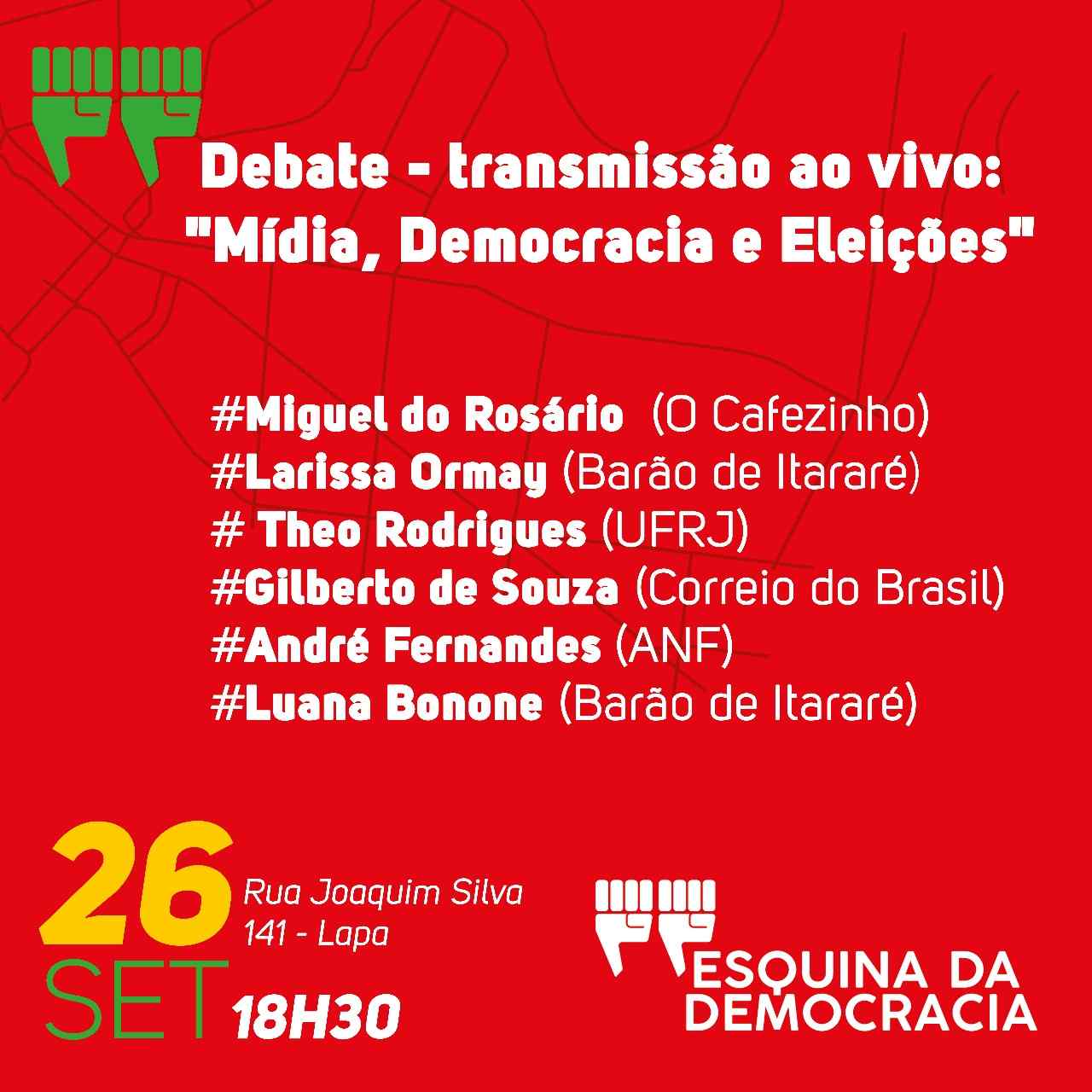 Hoje, no local chamado Esquina Democrática, ocupado por movimentos sociais para ser um ponto-de-encontro para discussões políticas na reta final das eleições, será exibido, em telão, o debate entre os presidenciáveis.