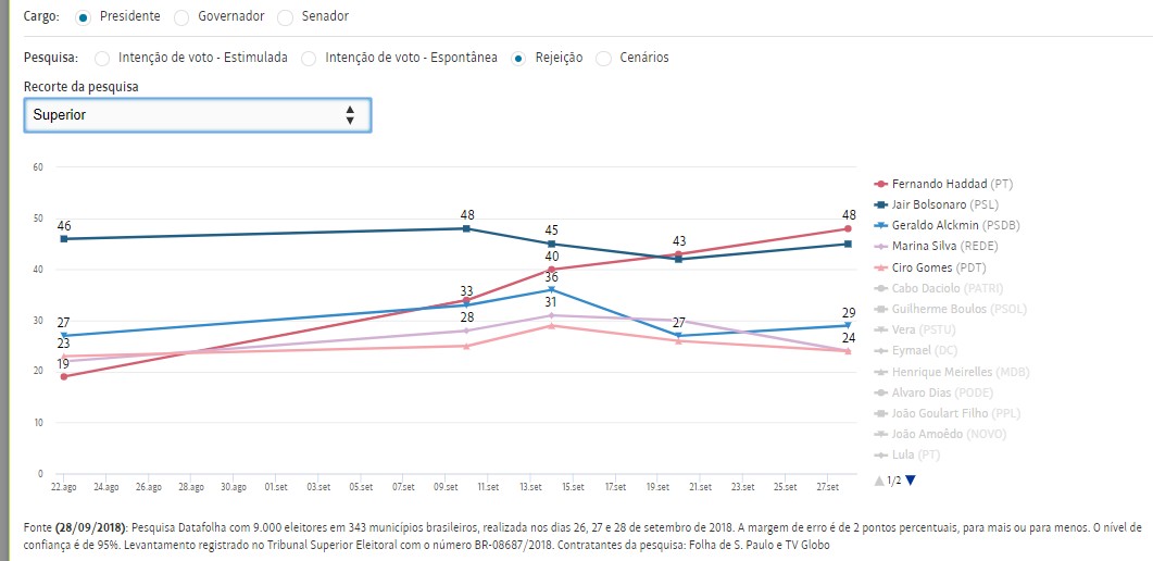 Entre eleitores com ensino superior, Haddad já ultrapassou Bolsonaro, e agora tem 48% de rejeição, contra 45% de Bolsonaro.