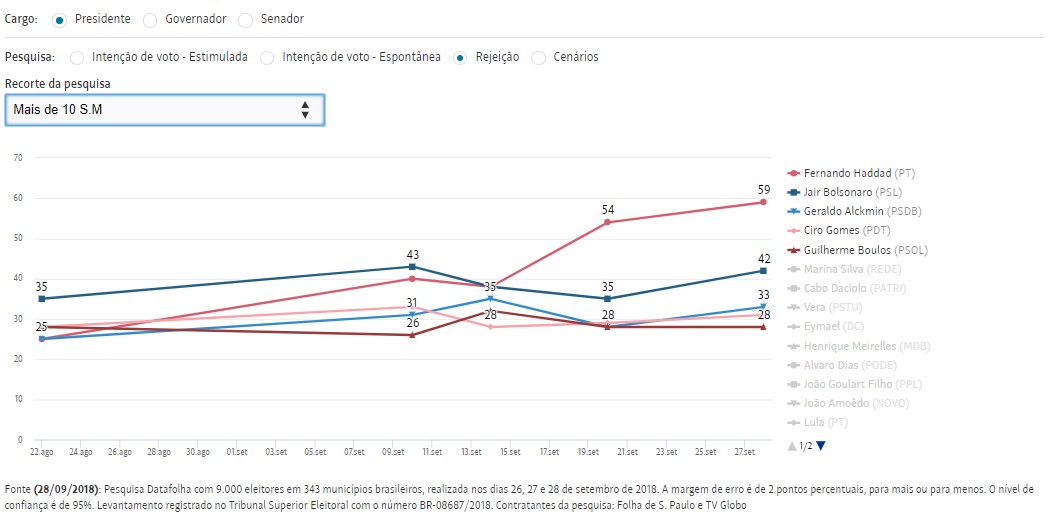 Entre eleitores com renda superior a mais de 10 salários, a rejeição ao petista subiu para 59%.
