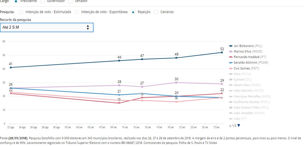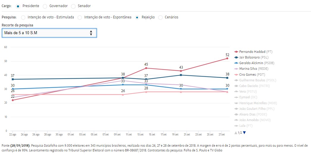 Entre eleitores que ganham de 5 a 10 salários, a rejeição a Haddad já bateu em 52% (basta lembrar que a rejeição total de Bolsonaro, muito alta, atingiu 46%).