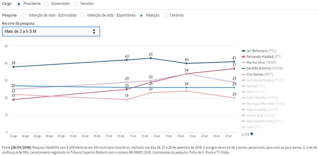 A rejeição a Haddad nas classes mais altas, por sua vez, continua crescendo muito, fazendo o candidato perder intenções de voto em alguns extratos, apesar de sua alta na média geral.