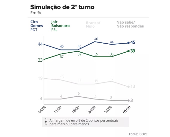 Apenas Ciro Gomes ganha com folga de Bolsonaro no 2º turno, por 45% X 39%, o que é facilmente explicável politicamente: Ciro consegue votos da esquerda e de parte dos eleitores críticos ao PT, mas que também não querem Bolsonaro, e que, por isso, tem facilidade para crescer no segundo turno.