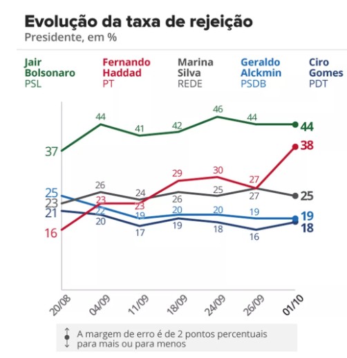 Acho que o apoio do edir macedo na sexta feira deve ter influenciado esse aumento, alem da grande exposicao que bolsonaro teve no sabado e no domingo com os movimentos contra e a favor de sua candidatura!!Quanto ao haddad ja era certo que sua rejeicao seria igualada a de bolsonaro quando os votos de marina e alckmin migrassem para outros candidatos!! Por isso o melhor da esquerda para enfrentar bolsonaro era o ciro gomes., que me desculpem os petistas mas e a pura verdade!!!