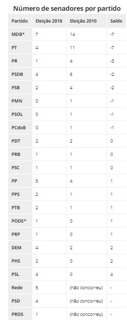 A dança dos partidos no Senado foi radical. O PMDB e o PT foram os que mais perderam: ambos reduziram sua bancada em 7 senadores. O PMDB de 14 para 7, o PT de 11 para 4.  O PCdoB perdeu a Vanessa Graziotin, e não tem mais representação no Senado.  PSB reduziu-se à metade: tinha 4 e agora tem 2. PDT manteve os seus 2.