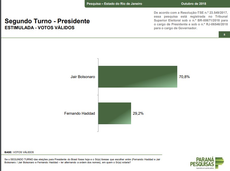 Sondagem eleitoral realizada entre os dias 14 e 16 de outubro, pelo Paraná Pesquisas, mostra o candidato Jair Bolsonaro com 70,8% dos votos válidos no estado do Rio de Janeiro. Haddad tem 29%.