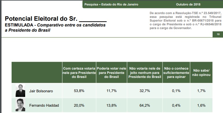 Sondagem eleitoral realizada entre os dias 14 e 16 de outubro, pelo Paraná Pesquisas, mostra o candidato Jair Bolsonaro com 70,8% dos votos válidos no estado do Rio de Janeiro. Haddad tem 29%. Baixe a íntegra aqui. Chama atenção ainda o grau de rejeição ao petista: 64% dos eleitores fluminenses disseram que não votariam “de […]
