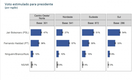 Entre os eleitores de Bolsonaro, 93% estão decididos e não vão mudar a intenção de votar no candidato de extrema direita. Outros 6% dizem que é uma possibilidade, mas ainda podem mudar e 1% não tem nada decidido. A região Sudeste é onde o voto em Bolsonaro está mais com solidado: 91% dos eleitores afirmaram que estão decididos a votar no candidato do PSL e que não vão mudar a intenção até o dia da eleição.