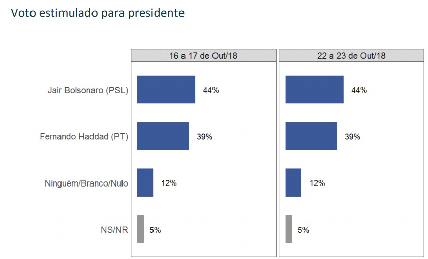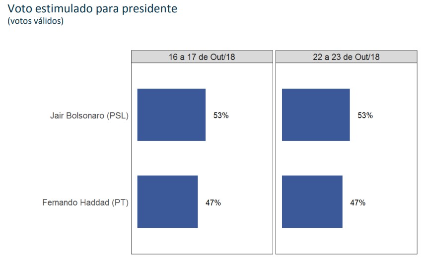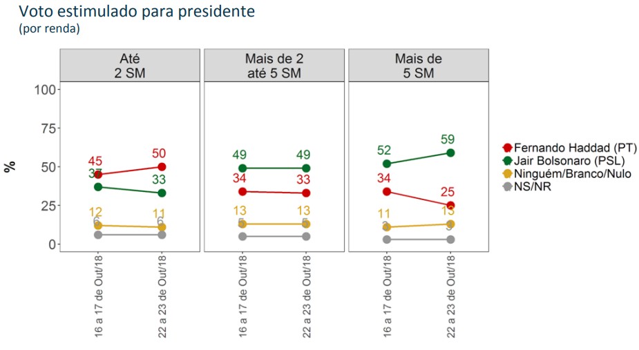 Bolsonaro, por sua vez, perdeu 4 pontos entre eleitores que ganham até 2 salários, mas ganhou 5 pontos entre eleitores com renda maior que 5 salários, e permaneceu com 49% entre eleitores da faixa intermediária (2 a 5 salários).