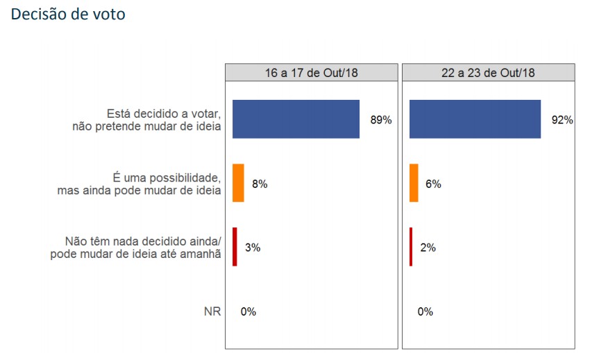 O Vox Populi mostra um quadro eleitoral bastante consolidado, com 92% dos eleitores decididos, sem pretensão de mudar de ideia. Este percentual está 3 pontos acima da última pesquisa, da semana anterior. O número de eleitores que ainda consideram mudar de voto oscilou 2 pontos para baixo, para 6%. Apenas 2% dos eleitores afirmaram que ainda não decidiram seu voto.
