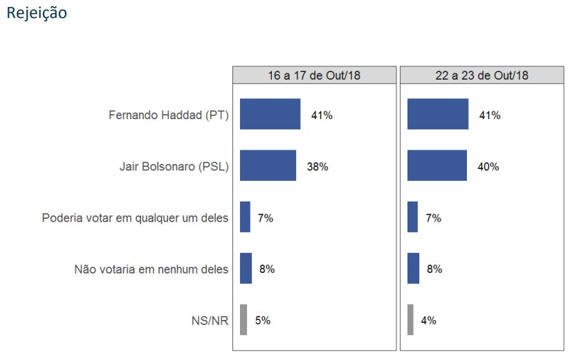 O Vox também trouxe dados relativos à rejeição dos candidatos. A rejeição de Haddad, estimada em 41%, permaneceu inalterada. Jair viu sua rejeição oscilar dois pontos para cima, atingindo 40%.