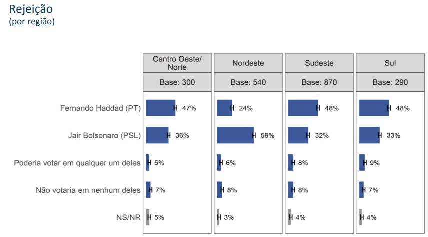 Na estratificação por região, temos uma rejeição muito alta de Bolsonaro no Nordeste, de 59%. Nas outras regiões, porém, é Haddad que tem problema sério de rejeição: 48% no Sudeste.