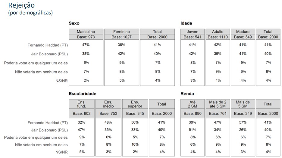 Em outras tabelas estratificadas, Haddad tem rejeição alta entre eleitores homens, 47%, mais instruídos e com renda acima de 2 salários. A rejeição do petista entre eleitores com renda acima de 5 salários é de 57%.