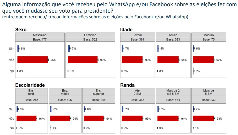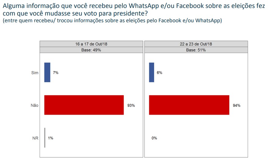 Segundo o Vox, apenas 6% dos entrevistados responderam que informações recebidas pelo whatsapp os fizeram mudar o voto para presidente. A maioria esmagadora, 94%, respondeu que nem whatsapp, nem facebook, tiveram influência sobre sua decisão.