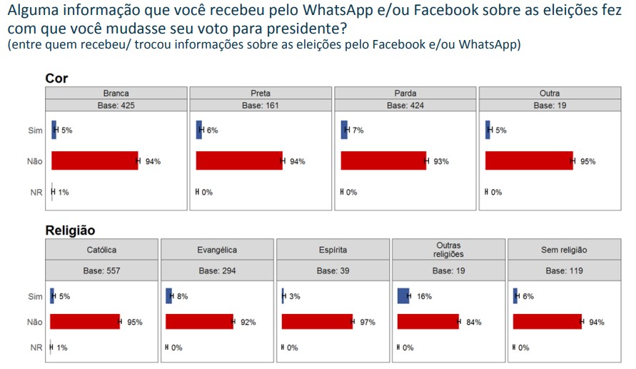 A pesquisa traz uma pergunta sobre a influência das duas redes sociais mais populares na formação do voto, certamente visando entender qual o peso das “fakes news” no primeiro turno.