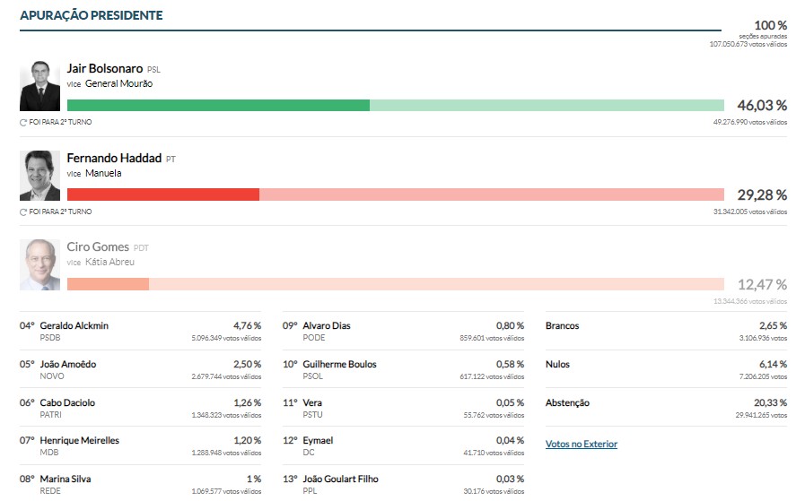 Haddad, herdeiro do lulismo, recebeu 31,3 milhões de votos, ou 29% do total.