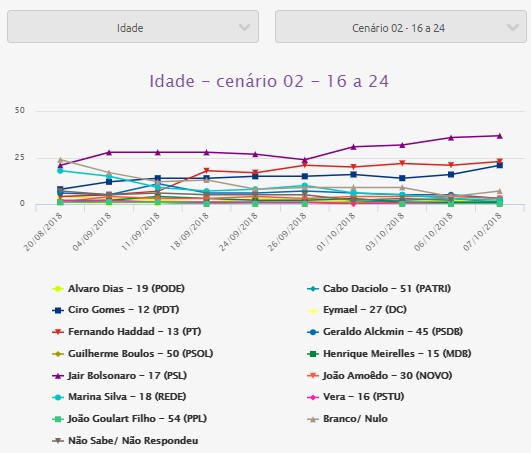 Na estratificação por faixa etária, o melhor desempenho de Ciro Gomes se deu entre jovens até 24 anos, onde ele obteve 21%, praticamente empatado com Haddad, que ficou com 23%; nessa mesma faixa, Bolsonaro pontuou 37%.