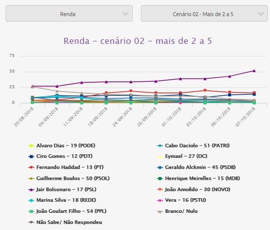 Na faixa de renda logo abaixo, de 2 a 5 salários, Ciro também teve um bom desempenho, ficando com 14% dos votos, quase empatando com Haddad, que pontuou 16%. Foi nessa faixa que Bolsonaro experimentou um crescimento expressivo às vésperas da votação, terminando com 52% dos votos totais.
