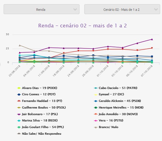 Bolsonaro também se descolou de Haddad e avançou muito rapidamente nos últimos dias, antes do primeiro turno, entre eleitores com renda entre 1 e 2 salários, pontuando 42%, contra 26% de Haddad e 11% de Ciro.