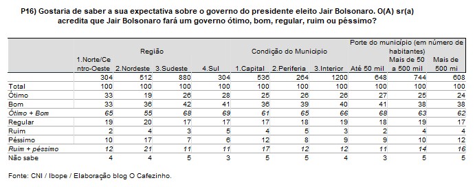 Mas Bolsonaro também está forte no Nordeste, onde 67% afirmaram que ele está “no caminho certo”. 64% dos dois mil entrevistados pelo Ibope esperam que o novo governo seja ótimo ou bom.