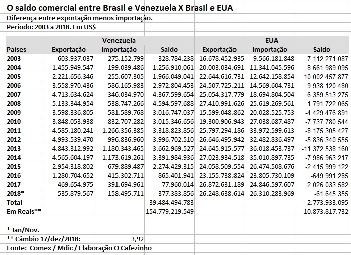 Eu fui ao site da Secretaria de Comércio Exterior, e levantei o comércio entre Brasil e Venezuela de 2003 a 2018, e, para efeito de comparação, também levantei o comércio entre Brasil e EUA.