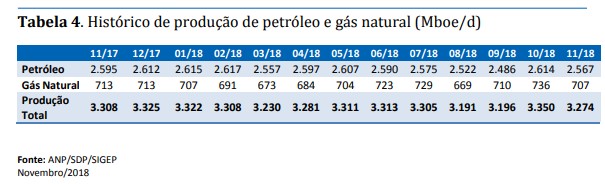Em novembro de 2018, a produção de petróleo e gás no Brasil foi de 3,274 milhões de barris de óleo equivalente por dia, uma redução de 2,3% em relação ao mês anterior. A queda se deve principalmente à realização de paradas para manutenção no FPSO Cidade de Ilhabela, no campo de Sapinhoá (Bacia de Santos) e nas plataformas P-18 e P-37, no campo de Marlim (Bacia de Campos).