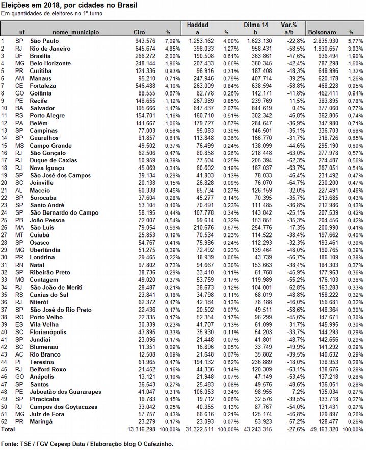 A tabela dos votos por cidade mostra que o desempenho de Haddad no Rio de Janeiro, no primeiro turno de 2018, foi quase 60% inferior ao de Dilma em 2014.