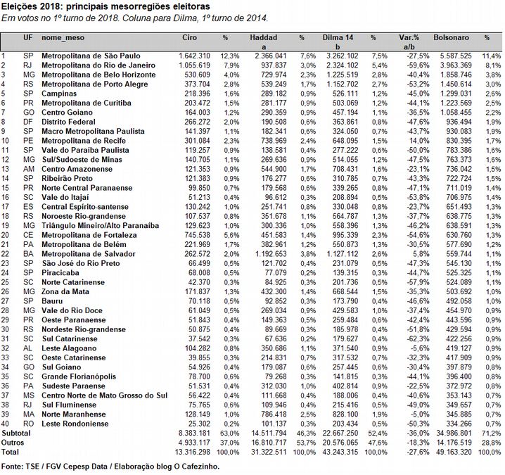Considerando as mesorregiões, fica patente a importância da região metropolitana de São Paulo para os principais candidatos: foi aí que Ciro conseguiu 12% de todos os seus votos; Haddad, 7,6%; Bolsonaro recebeu 5,6 milhões de votos na região metropolitana de São Paulo, ou 11,4% de todos os seu votos.