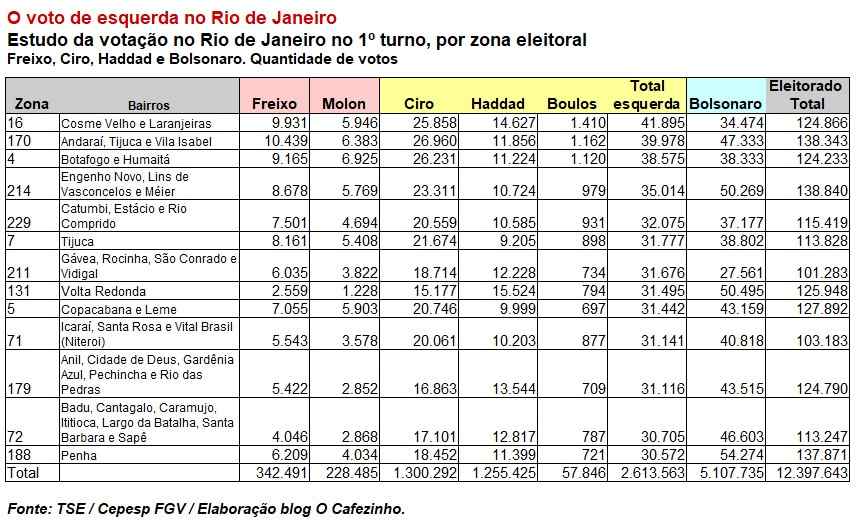 Optei por fazer um estudo sobre o voto de esquerda no estado do Rio, usando como referência a votação de cinco candidatos que me pareceram bastante representativos desse campo político: dois deputados federais, Marcelo Freixo (PSOL) e Alessandro Molon (PSB); e três candidatos presidenciais, Ciro, Haddad e Boulos. Incluí também uma coluna com a votação de Bolsonaro e outra com o total de eleitores registrados no TSE em cada zona.