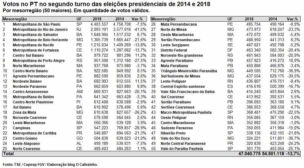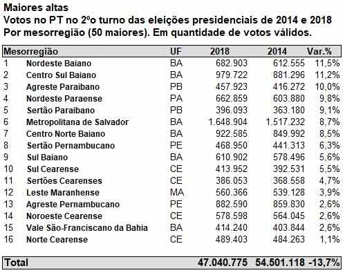 Para entender o que aconteceu, separamos as 50 mesorregiões onde o PT obteve mais votos e fiz três tabelas: uma, classificada por aquelas 20 áreas onde o PT mais perdeu voto de 2014 para 2018; uma segunda, com as 16 regiões (na verdade, as únicas onde ele cresceu, entre as 50 maiores) onde o PT mais cresceu; e uma terceira, com a lista das 50 mesorregiões, classificada pela quantidade de votos recebida em 2018.
