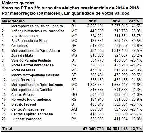 A maior queda do PT se deu na região metropolitana do Rio de Janeiro, a segunda maior do país. O PT perdeu, de 2014 para 2018, mais de 1,5 milhão de votos, apenas nessa região, uma queda de 41,5%. Em seguida, vieram três regiões de Minas: triângulo mineiro, vale do rio doce e sul de Minas. Na região metropolitana de Belo Horizonte, o PT caiu 22% de 2014 para 2018.
