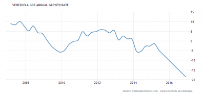De acordo com o FMI, o PIB da Venezuela em 2017 é 35% abaixo dos níveis de 2013, ou 40% em termos per capita. Essa é uma contração significativamente mais acentuada do que durante a Grande Depressão de 1929-1933 nos EUA, quando se estima que o PIB dos EUA tenha caído 28%. É ligeiramente maior que o declínio na Rússia (1990-1994), Cuba (1989-1993) e Albânia (1989-1993), mas menor do que o experimentado por outros ex-Estados soviéticos na época da transição, como a Geórgia, Tajiquistão, Azerbaijão, Armênia e Ucrânia, ou países devastados pela guerra, como Libéria (1993), Líbia (2011), Ruanda (1994), Irã (1981) e, mais recentemente, Sudão do Sul.