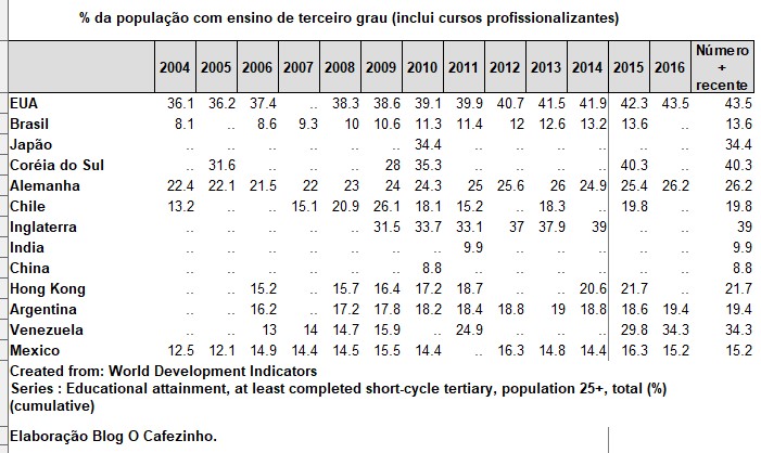 A tabela acima, com dados do Banco Mundial de países selecionados, relativos ao percentual da população com, no mínimo, um curso de terceiro grau (incluindo cursos profissionalizantes), retrata o atraso do Brasil em termos educacionais. Estamos muito atrás de países como Coreia do Sul, Venezuela (sim, até mesmo o “inferno bolivariano é melhor que aqui em educação) e Estados Unidos.