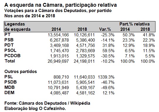 Eu preparei ainda uma tabelinha, com dados da própria Câmara, com a quantidade de votos dos partidos de esquerda, e alguns outros, em 2014 e 2018.