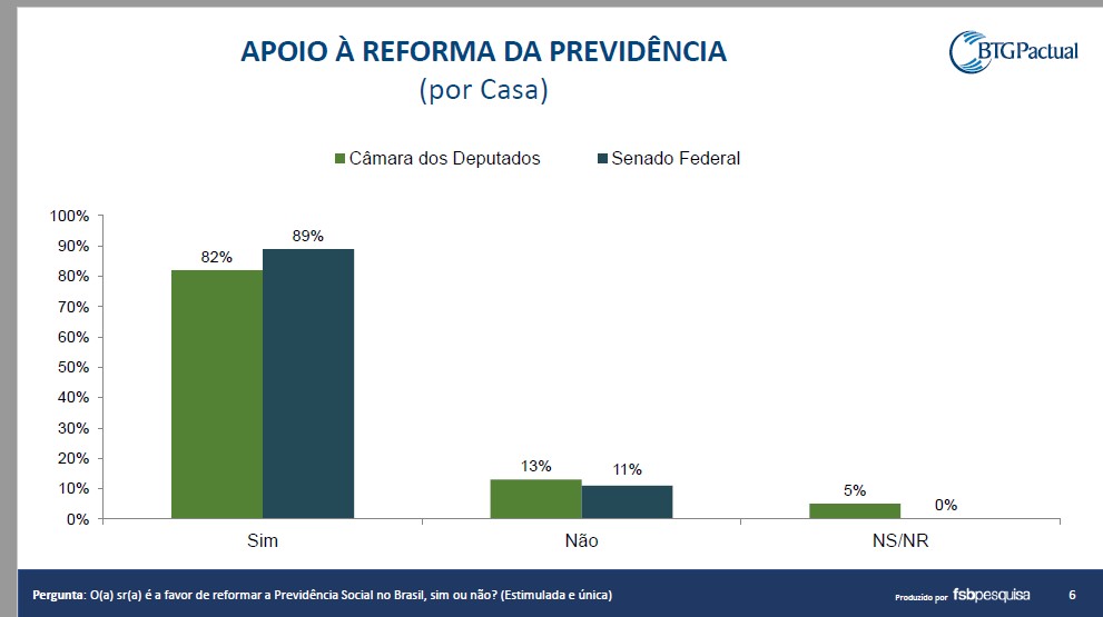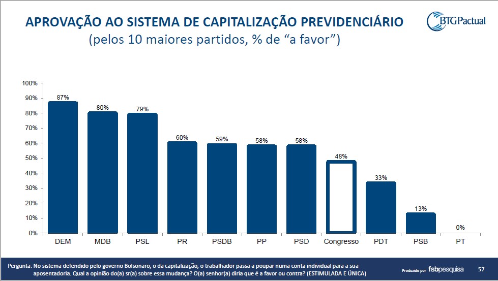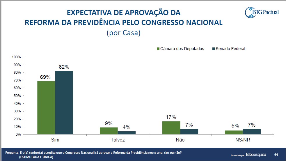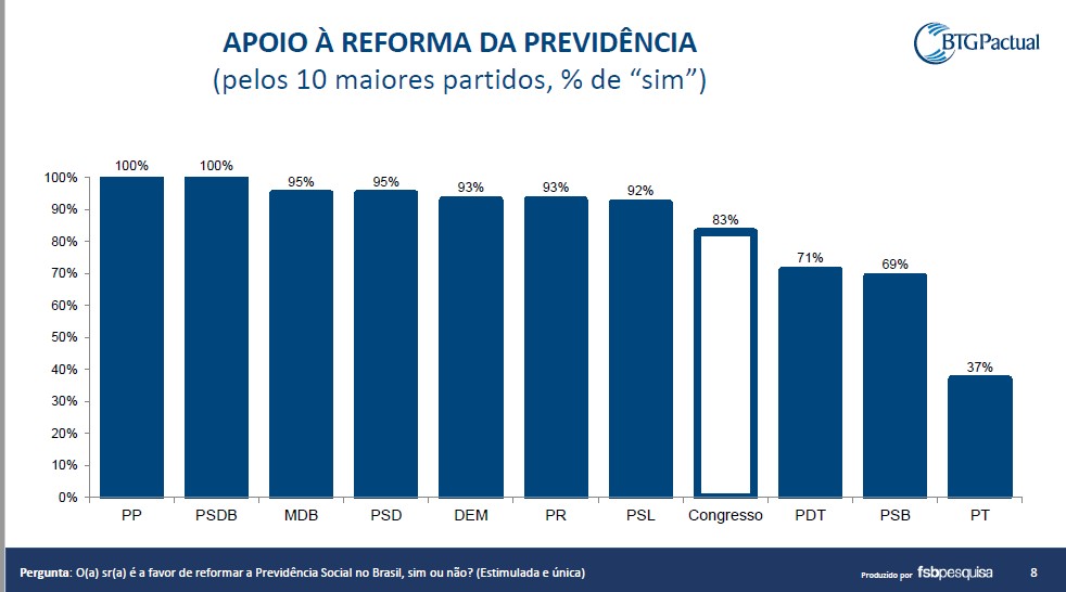 É muito interessante examinar essa pesquisa do BTG Pactual entre parlamentares. Separei alguns gráficos. Pesquisa BTG Pactual sobre reforma da previdencia – 4 a 8 de fev 2019 de Miguel Rosario